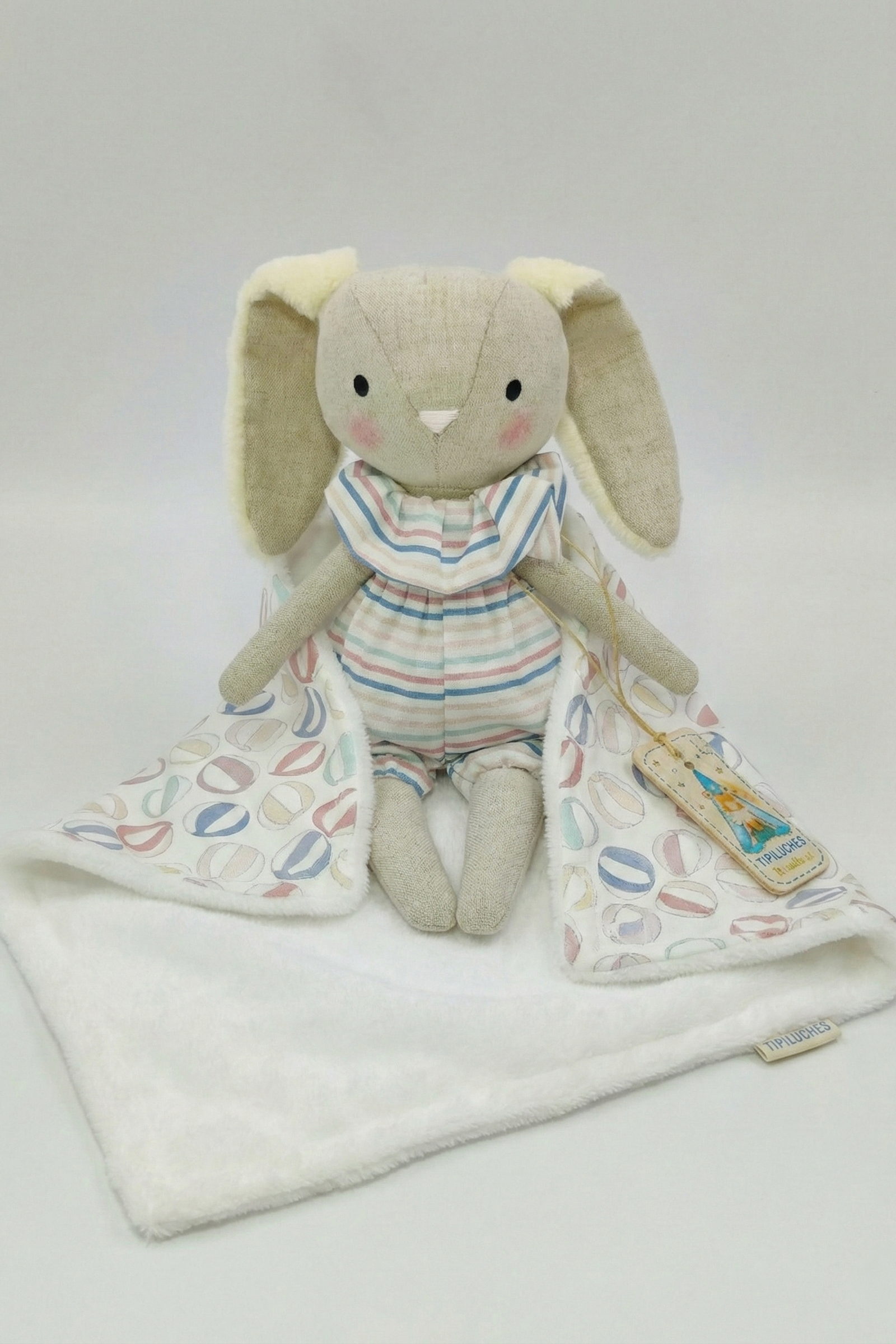 ¡Hola! me llamo Floppy, pero si quieres, puedes ponerme tu nombre. Soy un conejito bebé 100% artesanal, lo que me hace único. Mi cuerpo es de lino y algodón de máxima calidad y mi relleno es hipoalergénico. El interior de mis orejas es de suave coralina, mis ojos de vinilo textil, tengo la nariz bordada y las mejillas pintadas a mano. Estoy listo para cuidar a tu bebé dándole seguridad y protección cuando más lo necesite, hasta volvernos inseparables.